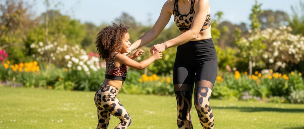 Sit side by side on a mat in your matching leggings and do simple stretches together. Turn it into a game: “Who can touch the sky the highest?”